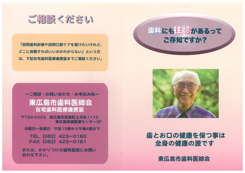 まずはかかりつけの歯科医院か、東広島市歯科医師会在宅歯科医療連携室までお気軽にご相談ください。